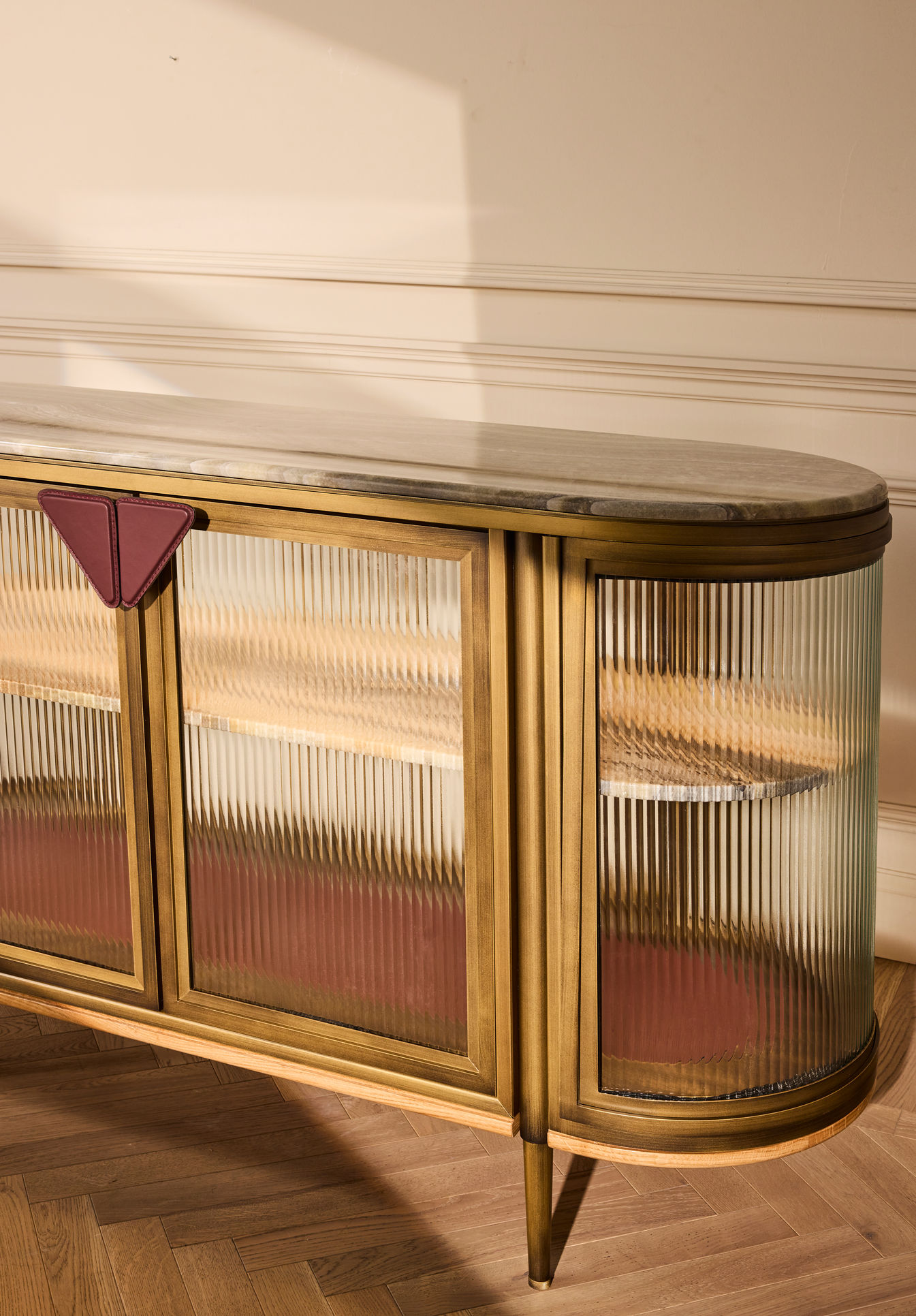 Shown in: Oak, Stone (Grigio Onyx), Brass (Antique), Leather (Handle), Fluted Glass